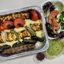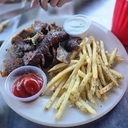 Empty on a Saturday night at 5:45. Good news - no wait for your food! We ordered a koobedeh combo plate (beef and chicken) ($16) and a gyro plate ($16). It came with warm pita and butter. Food came out after about 13 minutes. Chicken koobideh, amazing! Gyro, amazing! Beef koobideh, just ok, but I'll order all chicken next time. Saffron rice, delicious and the fries well crispy and peppery. This is my all-time favorite medditerranean place now! Will definitely be back! Too bad I live so far away!